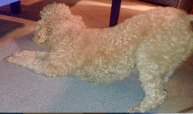In most literature and dog training, this is called a play bow or a stretch. However this style of bow, occurs when the abdomen is painful. Most people do not notice it since it can occur hidden. This dog, my dog, was under a table doing this. The dog with upper GI pain is subdued, tail down and tucked under not playful. The spittle image is just to show you the issue with bubbles in the upper GI that slows natural gas passage. Many dogs clear this issue of GI pain with the vomiting spittle, or eating grass then vomiting, or some dogs panic, eat a sock or foreign object which now complicates the problem making it a foreign body requiring surgery.