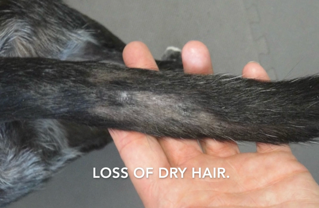 Both dogs and cats have an oil scent gland on the top of the tail near the base. The supracaudal gland is described in Miller’s Anatomy of the Dog as having fewer hairs per follicle associated with sebaceous glands that produces oily discharge. The area of the tail may have benign enlargement and become hairless with age. The oil glands can serve in grooming to repel water from the fur. The gland is prone to the follicles being plugged causing blackheads or comedones. The follicles can be cleaned of superficial dead skin and the comedones squeezed to relieve the plug. Stud tail is a common term used to describe over active tail glands with hair loss and excess oil production. In advanced cases of stud tail, glands have excess discharge and odor due to an infection of the follicles requiring medical attention. Rarely the gland develops tumors requiring removal of the area or tail.