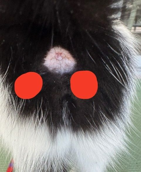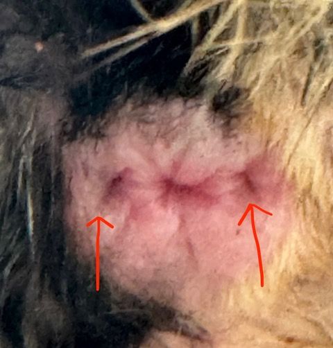 Older, obese or arthritic cats cannot get under the tail to clean the area with daily tongue grooming. The dried anal sac material forms a dark plug at the duct of the anal sac easily viewed when the tail is elevated.
