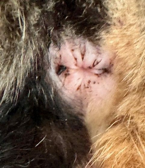 A gloved hand can carefully express the sacs to relieve the pressure. Some full anal sacs will rupture causing an abscess of the skin. Topical treatments and possible antibiotics are needed to heal the wound.